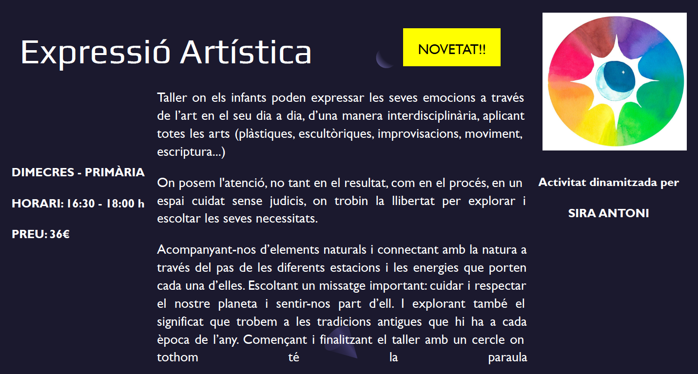 Comencem també el setembre amb una novetat meravellosa, el dimecres oferirem una nova extraescolar d’expressió artística!! (més info al PDF)